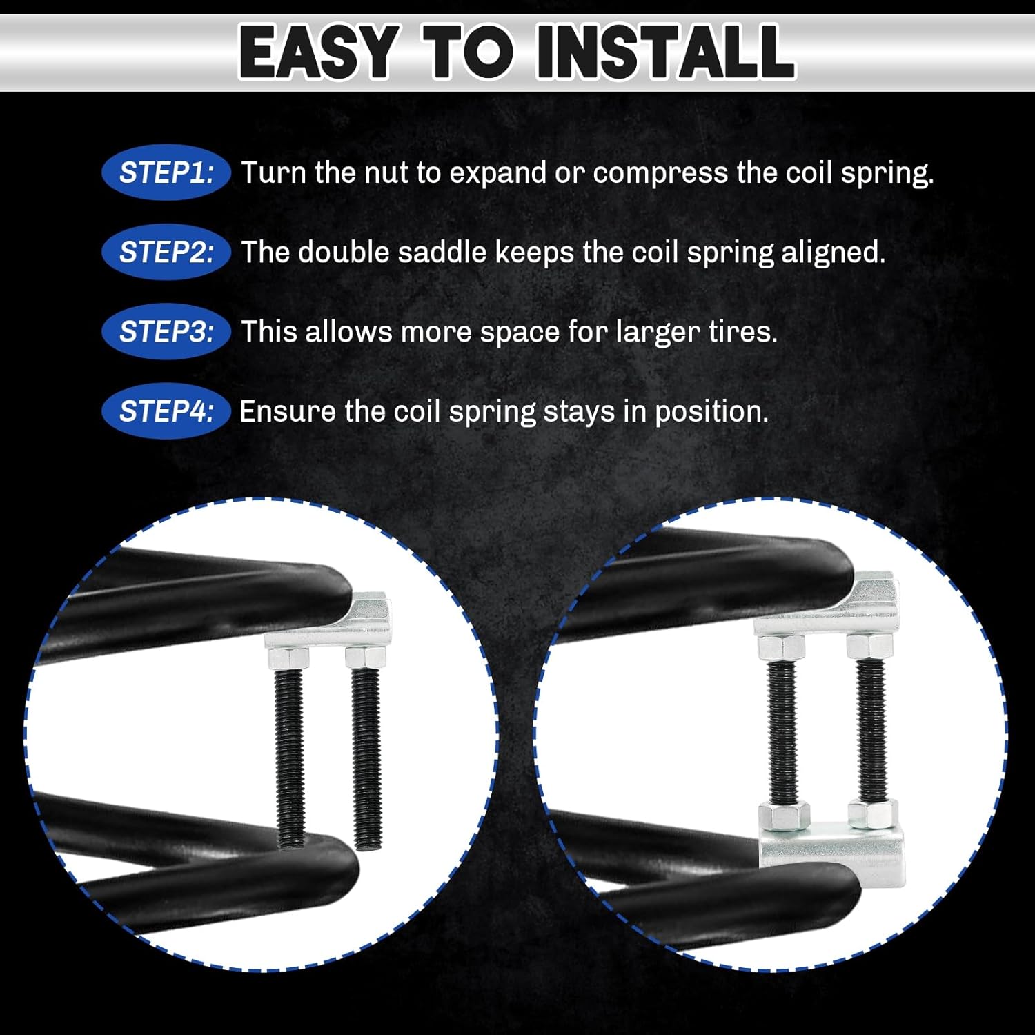 • 【Easy to Install】By rotating the nut to expand or compress the coil spring, the double saddle keeps the coil spring in the correct alignment position, providing additional clearance when adding larger tires, help the coil springs to stay in the right position.