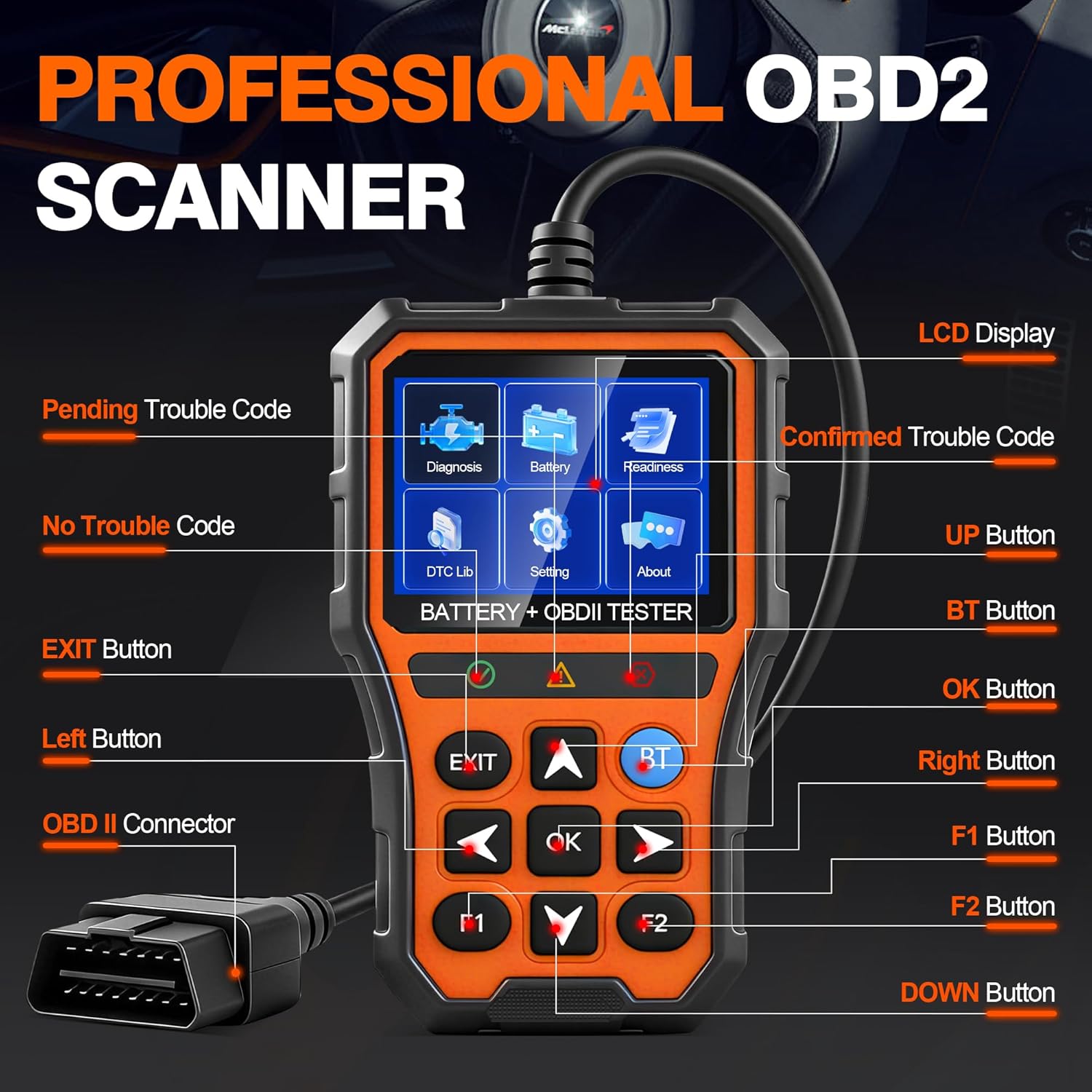 2-in-1 PRO OBD2 Scanner Diagnostic Tool, Car Code Reader with Battery Tester, Check Engine Code Reader with Reset OBDII, Real-Time Date, DTC Lookup, Scan Tool for All OBDII Protocol Cars Since 1996