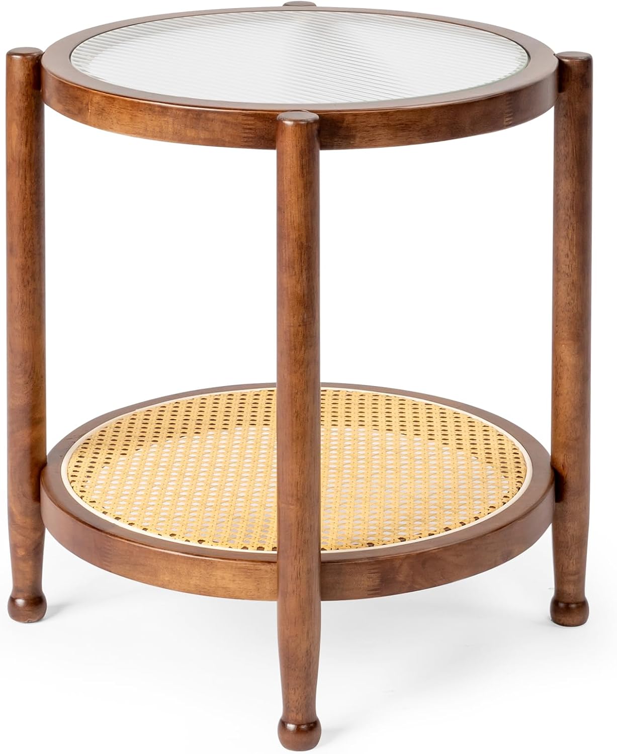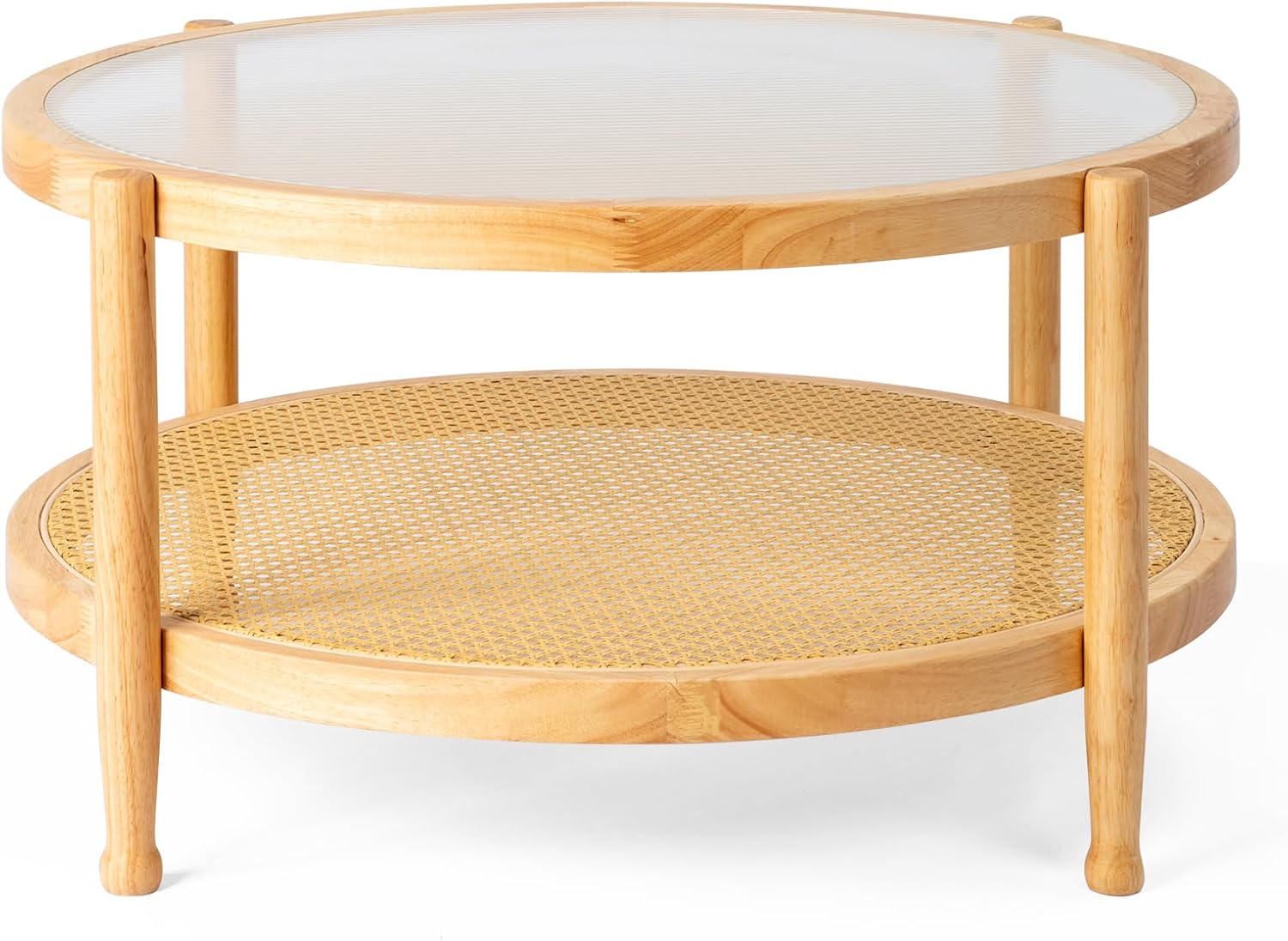 19.7in Rattan Coffee Table with Glass Top, Small Round End Table, Side Sofa End Table for Living Room Specifications: 1. Material: Rubberwood 2. Dimensions: (31.5 x 31.5 x 17.3) in 3. Tabletop Size: (31.5 x 31.5) in 4. Table Height: 17.3 in Package Includes: 1 x Wood Coffee Table 1 x Hardware Pack