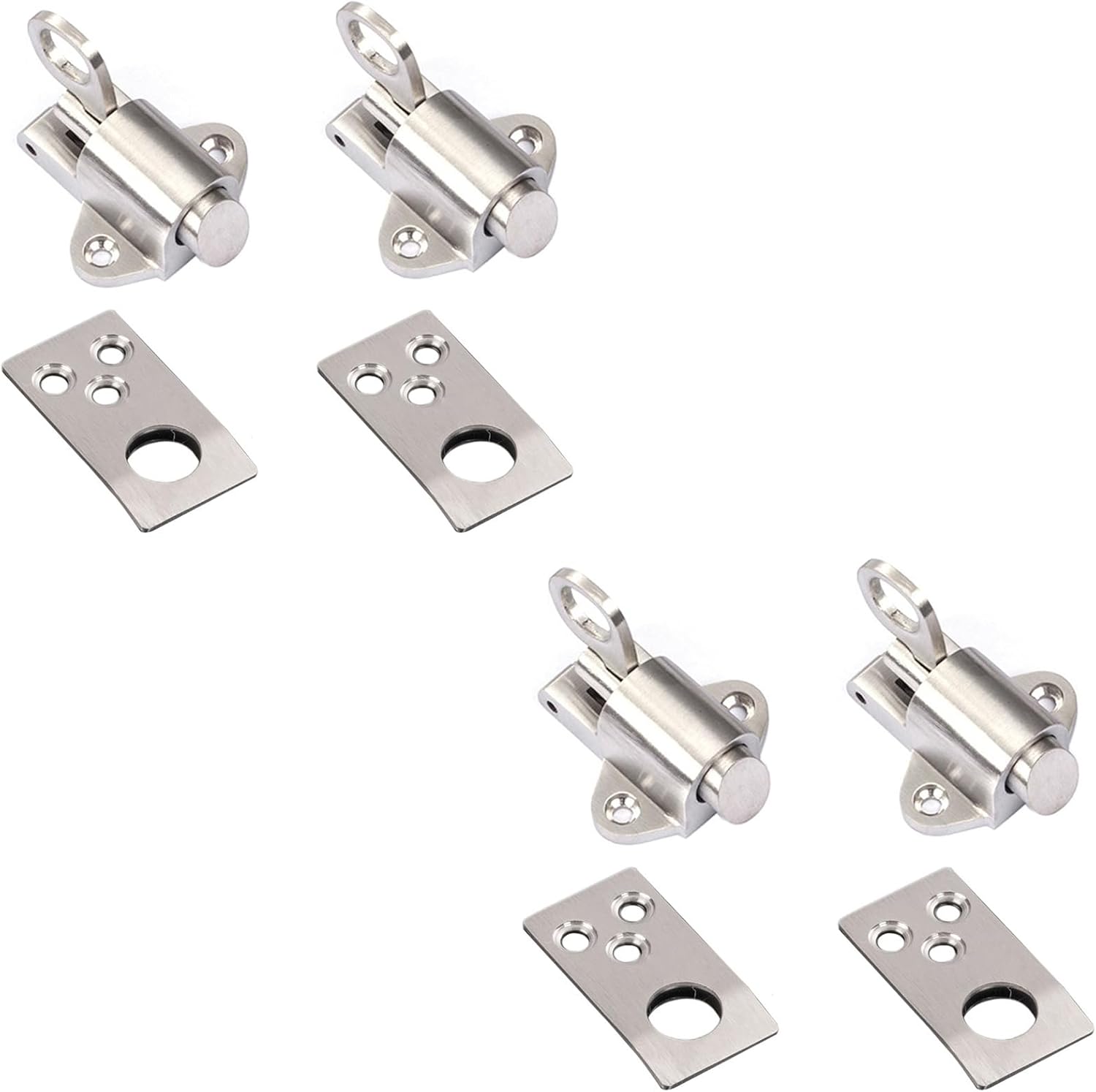 Feature:【Secure Locking】The built-in high-tension spring enables the bolt to snap into place automatically once closed, eliminating the risk of loose latching or accidental openings. Ideal for gates, sheds, cabinets, or toolboxes—provides reliable security against wind, pets, or unauthorized access.【Strong and Durable】Crafted from corrosion-resistant stainless steel materials, this bolt latch withstands rain, snow, UV rays, and extreme temperatures. It resists rust, bending, and wear, ensuring long-term performance for both indoor storage and outdoor applications like garden gates or garage doors.【Smooth Operation】The latch opens and closes with a smooth glide and is not prone to jamming, even with repeated use. The ergonomic latch handle ensures easy one-handed operation, perfect for situations where you're carrying items (such as gardening supplies, toolboxes, etc.) that need to be opened/closed quickly without fumbling.【Easy to Install】Save time with the latch's user-friendly installation process. It comes with mounting screws —no specialized tools or professional skills required. Most users can install it in under 10 minutes.【Wide Application】This door lock has a wide range of applications and is suitable for securing chicken coops (to keep predators out), RV storage (to prevent rattling while traveling), children's playhouses (for added security), or shop cabinets (to secure valuable tools).Specification:Name: Spring Load Bolt LatchMaterial: Stainless SteelSize: As ShownModel: SquarePackage Included:4 * Spring Load Bolt Latches