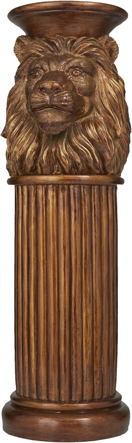 The aluminum is intricately welded to create curved structure and glazed with a shiny coating. Our slim rectangular pedestal table features an intricately carved horse's head on a pilar shape, with detailed grooves around the base, and a flat square tabletop. Wipe clean with a dry cloth. A practical yet stylish upgrade that instantly elevate the look of your room. Display your plants, decor or your favorite art piece on this beautifully crafted pedestal table. Provide maximum room without crowding the ground with this horse pedestal table that can be used to display your favorite sculpture, vase, or decorative object. This item ships in 1 carton. Suitable for indoor use only. This item ships fully assembled in one piece. Maximum weight limit is 25 lbs. This is a single brown colored drink table. Traditional style.