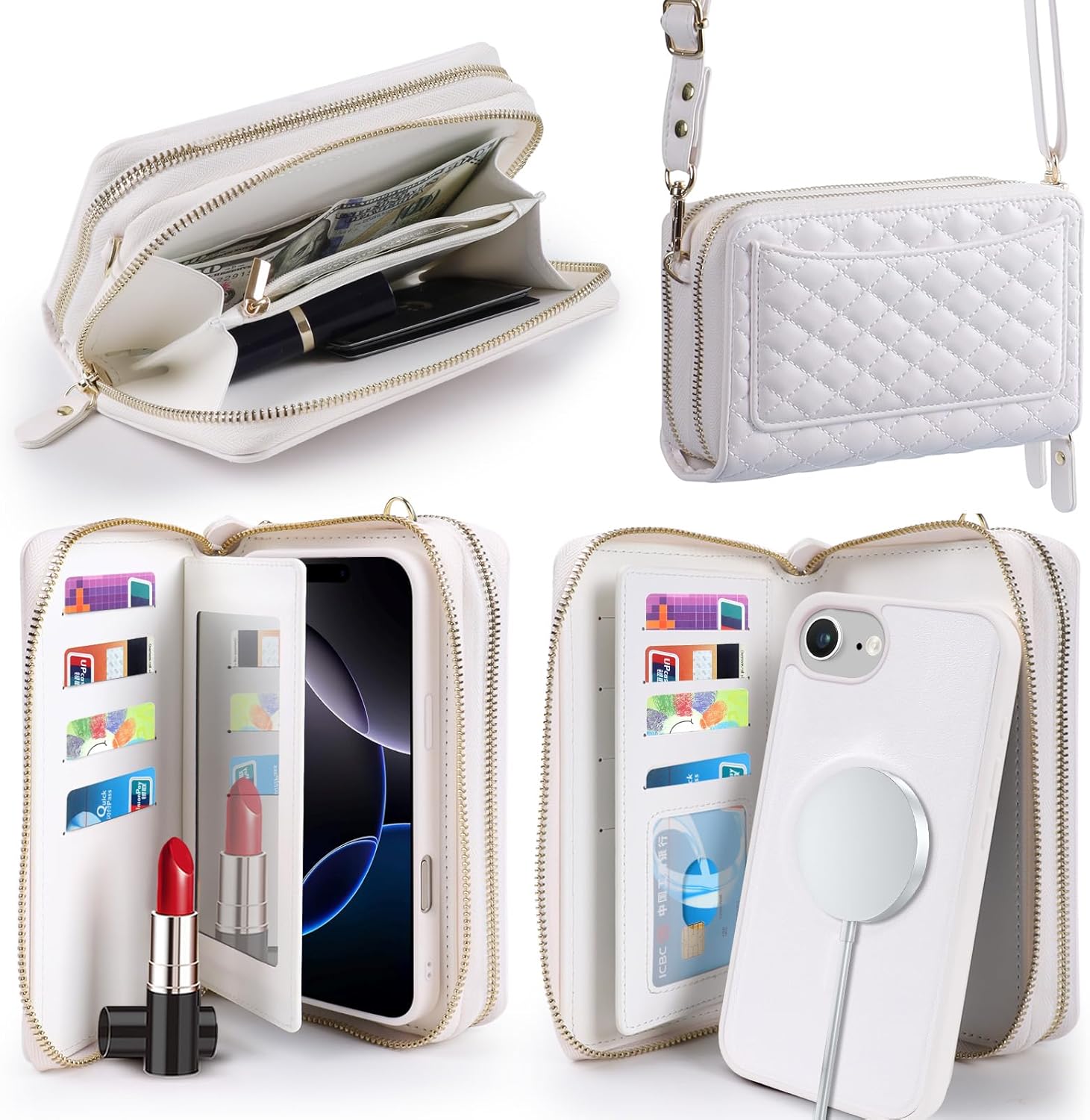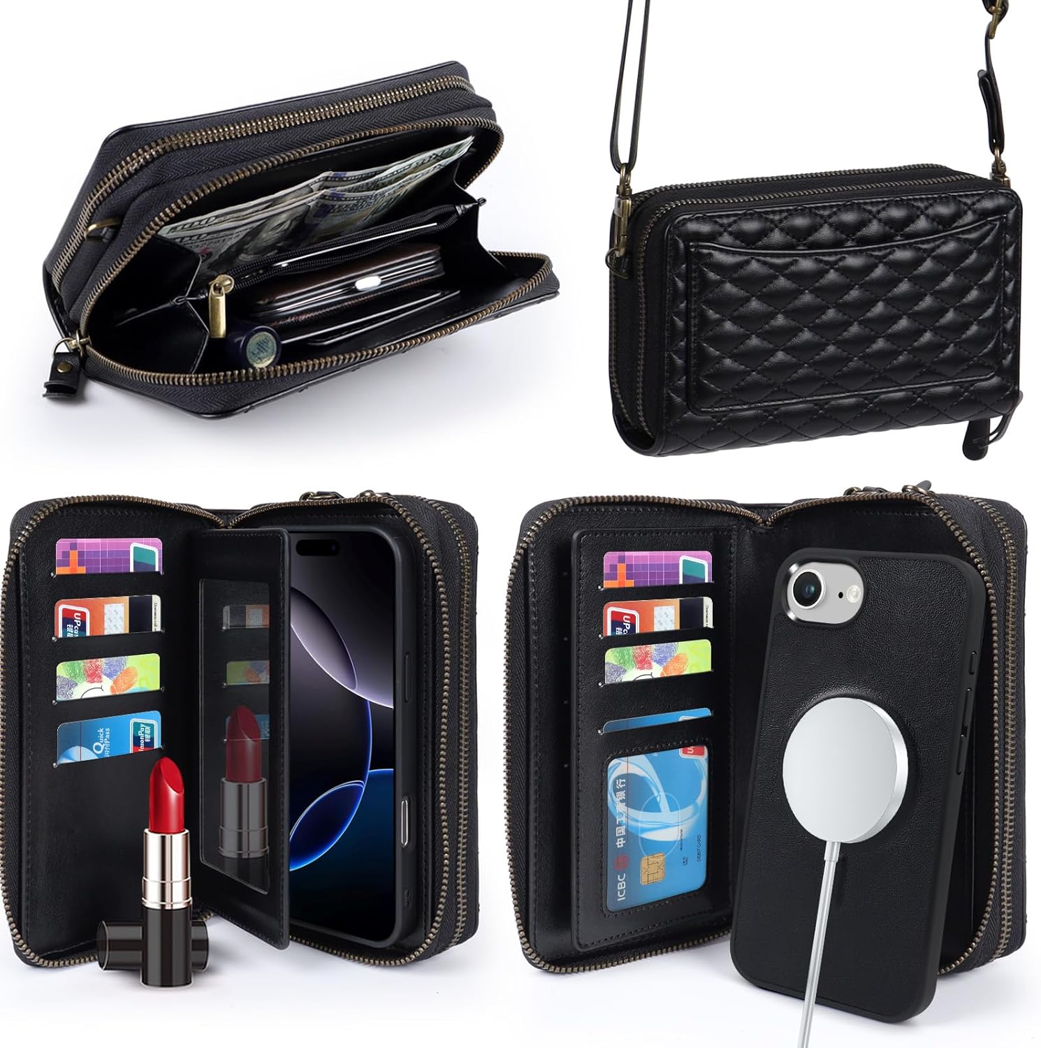 Harryshell Compatible with iPhone 16 Pro Max Case Wallet Multi Zipper Detachable Removable Cover Purse with Card Slots Holder Mirror Crossbody Wrist Strap for 6.9 inch 2024 (Light Brown)