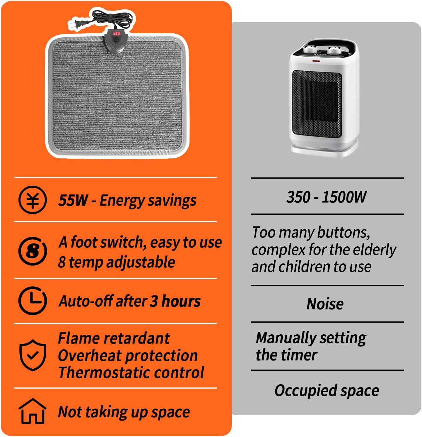 【Wider Size / Durable Material】Our electric foot warmer mat are wider than other feet warmers on the market(Size:15.53 * 17.72 inch), and Can easily accommodate people with long feet. The surface material of this heated foot rest under desk is high-quality thermal conductive floor leather, which is waterproof, wear-resistant, insulating, and flame-retardant. The back of the heated office mat is light-colored non-slip silicone (will not fade and will not stain the floor).