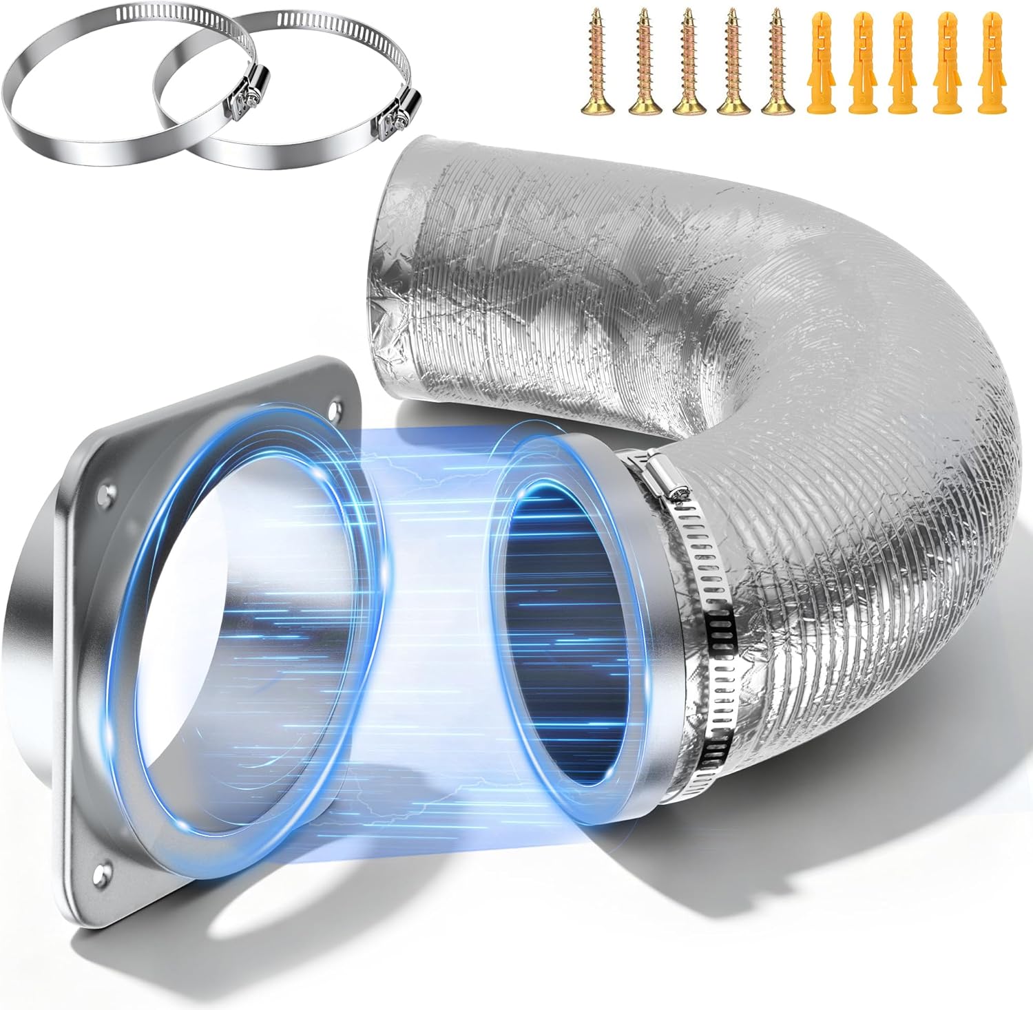 Included Components magnetic dryer vent coupling x1, 2.6 FT of 4" Aluminum Foil Hose x1, Screws×4, Stainless Steel Hose Clamps x2