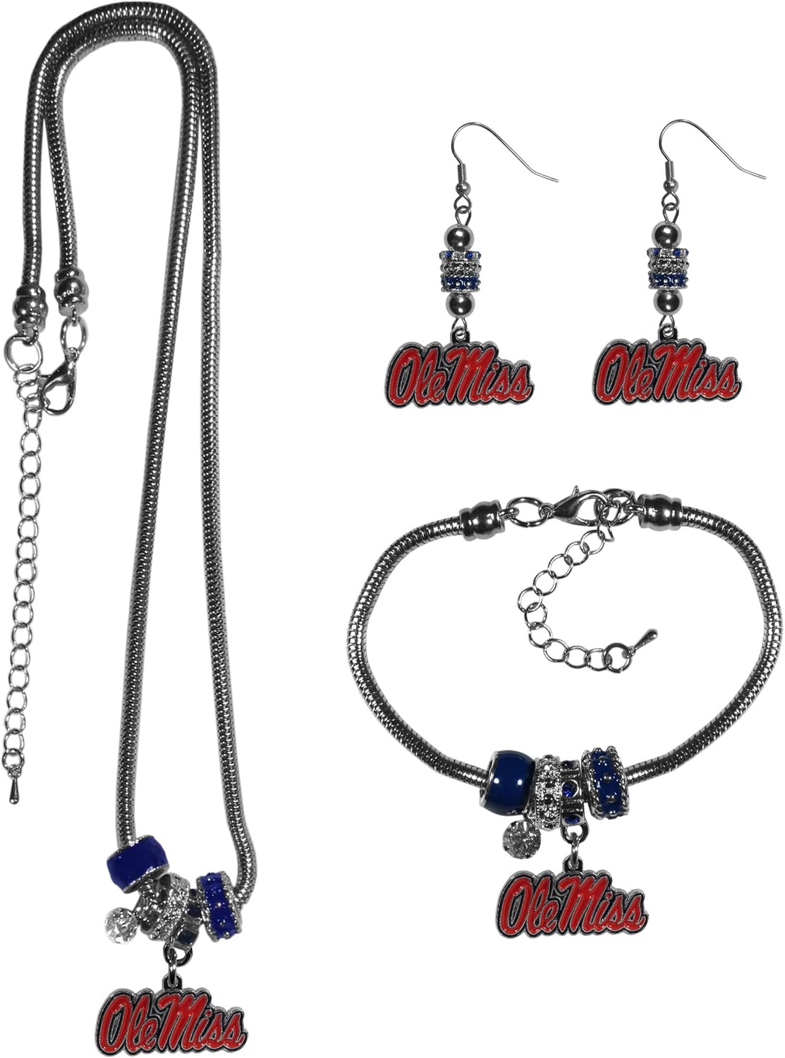 This must-have collegiate look features the wildly popular Euro bead style teamed with eye catching team charms. The 18 inch, snake chain necklace is paired with delicate matching earrings with hypoallergenic, steel fishhook posts and matching bracelet.