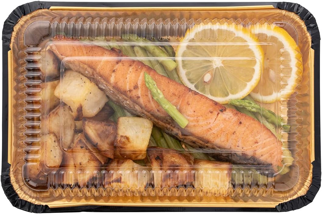 Pack up classic entrees, sides, and desserts using our Foil Lux Rectangle Clear Plastic Lids. Designed to securely fit onto our matching 27-ounce aluminum containers (SKU: RWM0113B), these rectangular lids are great for packaging large orders at your restaurant, cafe, or catering service. Made with high-quality plastic, these lids for food containers are crack-resistant and break-resistant to keep delicious meals intact during delivery. These transparent lids have a rolled rim that expertly snaps on to containers to prevent foods from spilling over while on the go. The clear, high-shine finish of these rectangular lids perfectly shows off your creative food presentations, while the domed design provides ample space to safely hold plenty of food. These lids for food containers are recyclable, and allow customers to dispose of lids in an eco-friendly manner after use. Measuring 8 inches in length by 5.25 inches in width and 1 inch in height, these transparent lids are sold in a 200 count box. Containers are available and sold separately.