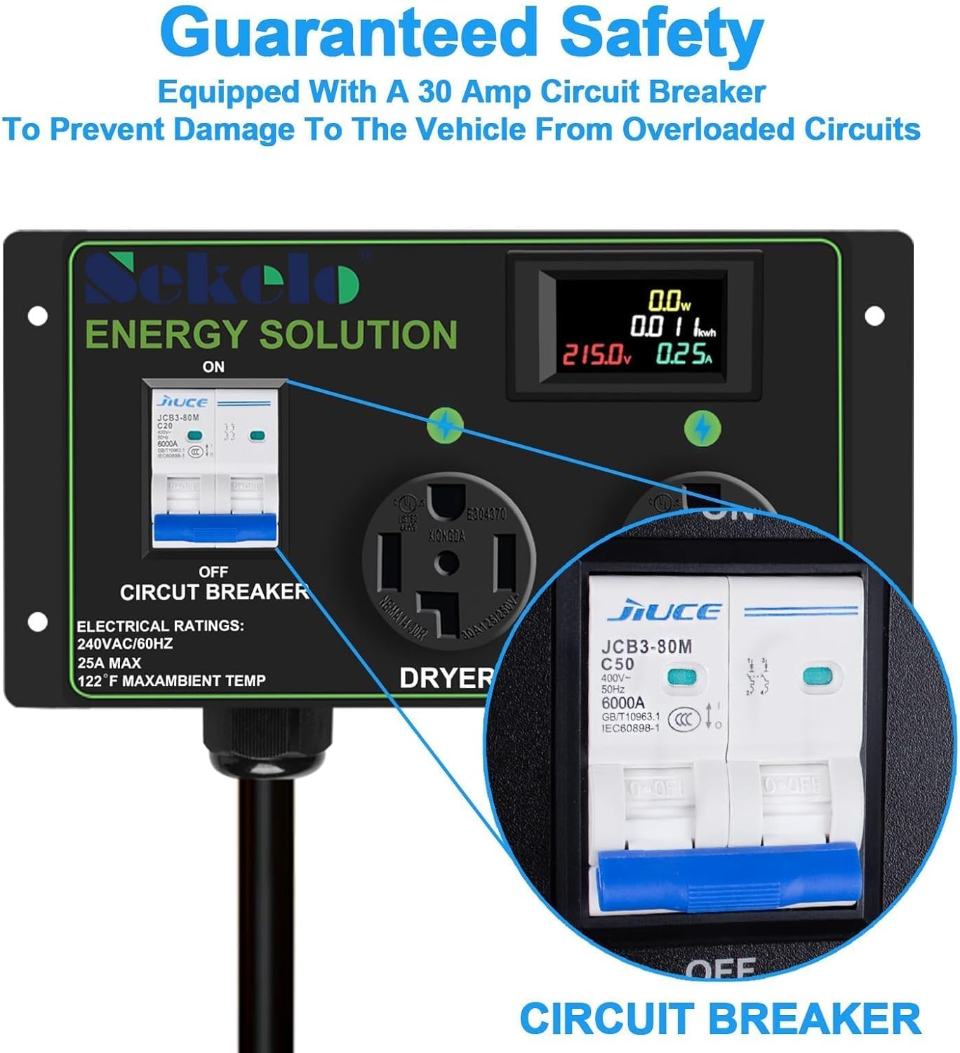 Smart EV Charging Integration: Sekelo Automatic Power Switch for Dryer & EV, NEMA 14-30P to 14-30R & 14-50R, 240V, 24A 5.76kW Max Power Splitter, Fast Charging, Real-time Display