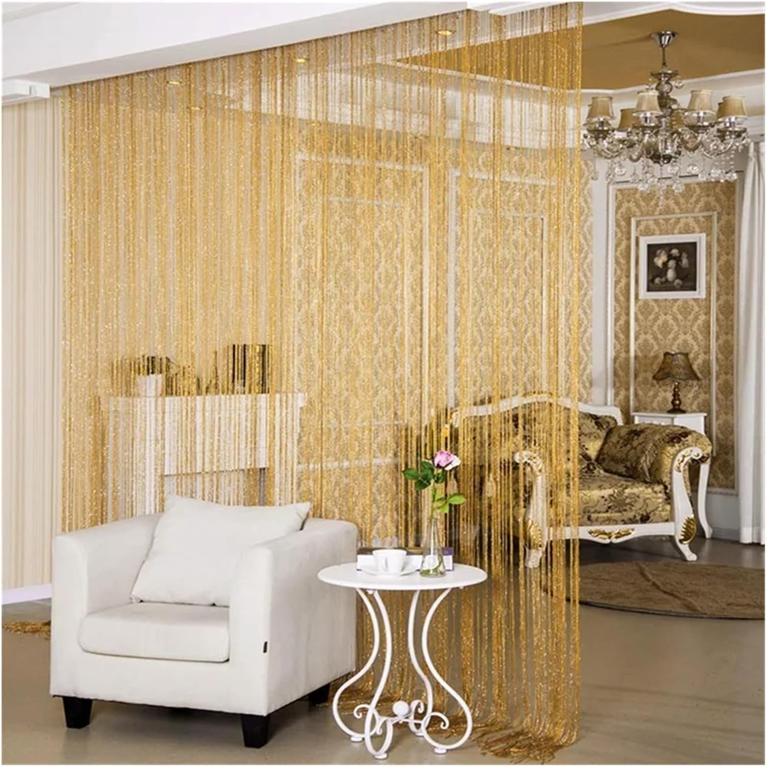 Made of polyester material, elegant design with glistering silver ribbonHave a slot top and are suitable for a tension rod, pole or wire, this line curtain helps form a relaxed atmosphere in any environmentA modern way to decorate your window or door. Can also be used as a Fly Screen or Room DividerSize: 2m high, 1m wide, and approximately 2cm thickMaterial: Made of high-quality polyester thread and silver thread, finely wovenBecause the thread curtains are all manually cut and each one has independence, the same order may also have different lengths and need to be uniformly cut by oneself.Packaging list: 1 piecesHow to measure curtain size ?Window Curtains width=2xA(Twice of the Pole or Track width)Window Curtains Length=B/C/D( Up to you)Width:1. Measure your track or pole(A)2. Calculate your curtain width:Pole or track width( Ax2 )For a whole window,two panels are better.Heigth:1.Decide where your curtains will end(B)Sill length:End 1.25cm(1/2'') above the windowsill(C)Below Sill:End 15cm(6'') below the windowsill(D)Floor length:End 1.25cm(1/2'') above the floor2.Measure the dropTrack: Measure from the end of the track to your chosen end point.Pole:Measure from the top of the pole to your chosen end point.The curtain width should be twice the length of the curtain rod.(For example : The length of curtain rod=2 meters. The width of curtain=4 meters.)