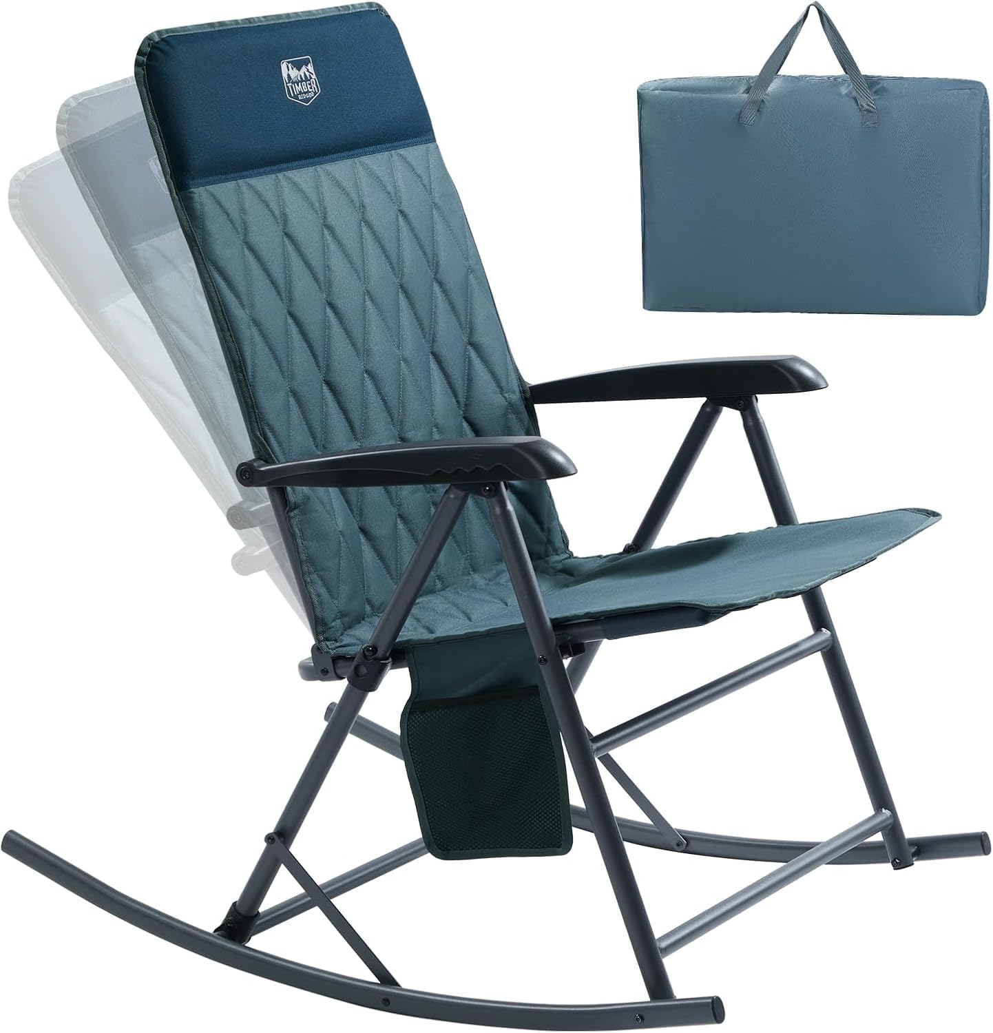 Elevate your outdoor lounging experience with the TIMBER RIDGE Folding Rocking Chair. Crafted with portability and comfort in mind, this chair is your go-to solution for leisure anywhere, anytime. With its luxurious 28-inch high backrest and plush cushioning, relaxation is effortless. Customize your comfort with three adjustable recline settings. Constructed to withstand outdoor adventures, the rock-solid frame effortlessly supports up to 300 pounds. This rocker camping chair has a triangular base design to ensure stability and smooth rocking motions, ideal for unwinding in nature. Stay organized with convenient side pockets and a bottom mesh pocket for essentials. Whether you're camping, picnicking, enjoying concerts, or lounging in your backyard, this versatile heavy-duty camping chair for adults delivers. Fold it down to a compact size and store it in the included carrying bag for easy transport. With its sleek design and durable functionality, this Folding Rocking Chair is the ideal companion for all your outdoor activities.