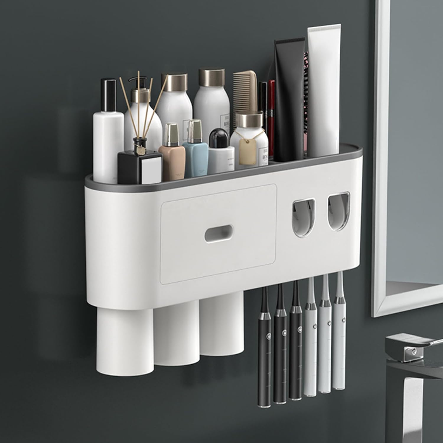 Description: Organize your bathroom efficiently with our toothbrush holder and automatic toothpaste dispenser set. The wall-mounted design saves valuable counter space, creating a clutter-free sink area. Two independent dispensers let you give different toothpaste choices for family members, dispensing a consistent amount each time. The cleverly designed magnetic cups hang upside down, enabling water to drain quickly and keeping cups drier. Six dedicated slots hold toothbrushes securely, including electric models. Additional storage on top and a slide-out drawer help manage other bathroom necessities like razors or cosmetics. Installation is straightforward with the included adhesive strips for compatible smooth walls. Constructed from sturdy, easy-clean ABS material, this gray organizer is a practical addition to any modern bathroom.Features:. Automatic Toothpaste Dispenser. -Color: Gray. -Material: Plastic. Note: Manual measurement, please allow slight errors on size. The colors may exist slight difference due to different screens. Package Including 1 x Automatic Toothpaste Dispenser