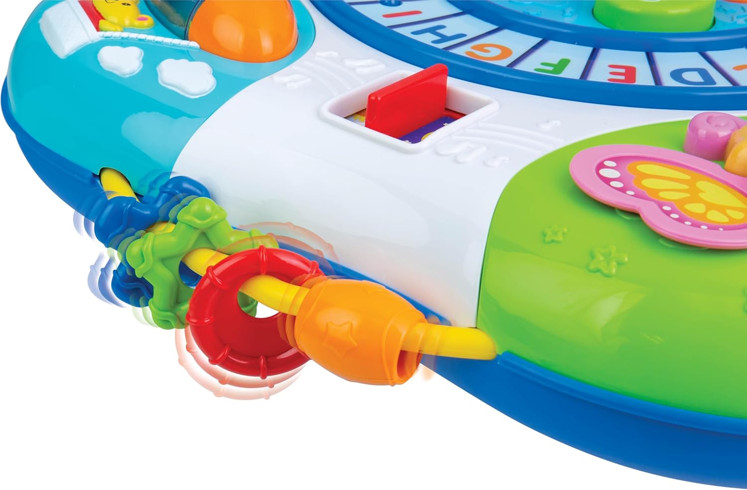 Product Description Learn Colors, Shapes, Animals and More from this Activity Table. Push the Train along the Alphabet Track to Sing Along with the Alphabet Song. Use 5 Note Keyboard with Flashing Lights to Create Music. Many Sound Effects and Activities to Build Motor Skills. From the Manufacturer Letter train and piano activity table has detachable legs so floor play is anoption. The alphabet table has simple learning and play activities tokeep baby occupied and learning. The push train circles the alpabet letters. The 5 note piano board has flashing lights. The train whistle, gearshift, spinner, sliding bee and flapping butterfly offer fun sound effects.